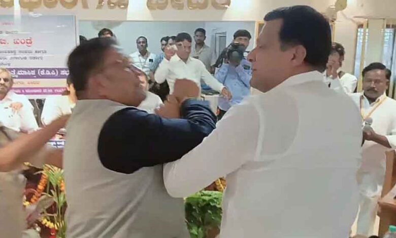 कर्नाटक के बीदर में उस वक्त एक शर्मनाक दृश्य देखने को मिला, जब भाजपा और कांग्रेस के विधायक राज्य मंत्री के सामने ही हाथापाई पर उतर आए। यह वाकया जिला पंचायत हॉल में चल रहे कर्नाटक डेवलपमेंट प्रोग्राम की मीटिंग के दौरान हुआ। दरअसल मीटिंग में हुमनाबाद विधानसभा क्षेत्र में जंगल की जमीन के बारे में चर्चा हो रही थी। इसमें जिला प्रभारी मंत्री ईश्वर खंड्रे, भाजपा विधायक सिद्दू पाटिल और कांग्रेस MLC भीमराव पाटिल शामिल थे। तभी जमीन पर कब्जे के विवाद को लेकर दोनों नेता आपस में भिड़ गए।