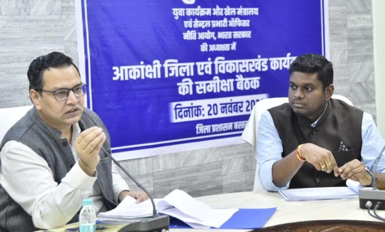 नीति आयोग द्वारा नियुक्त बस्तर जिले के नोडल अधिकारी एवं संयुक्त सचिव  शोभित जैन ने बस्तर आकांक्षी जिला और ब्लॉक कार्यक्रमों की प्रगति की समीक्षा बैठक जिला कार्यालय के आस्था सभाकक्ष में ली। बैठक में  कलेक्टर  हरिस एस ने जिले और ब्लॉक में आकांक्षी कार्यक्रम के अंतर्गत योजनाओं के क्रियान्वयन के संबंध में विस्तृत जानकारी दी और समस्याओं के संबंध में भी अवगत करवाया।