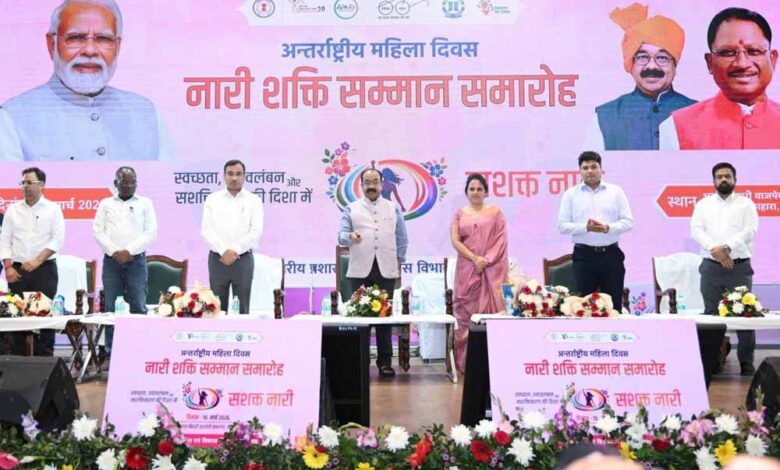 महिलाएं ईश्वर की अनुपम कृति हैं। ईश्वर ने उन्हें विशेष शक्तियां और क्षमताएं दी हैं। महिलाओं ने अपनी लगन, मेहनत और काबिलियत से हर क्षेत्र में अपना स्थान बनाया है। हर क्षेत्र में उपलब्धियां और ऊंचाईयां हासिल की हैं। माताओं व बहनों का सम्मान एवं विशेष स्थान प्राचीन काल से हमारी संस्कृति और परंपरा में है। उप मुख्यमंत्री तथा नगरीय प्रशासन एवं विकास मंत्री अरुण साव ने नारी शक्ति सम्मान समारोह में ये विचार व्यक्त किए। उन्होंने नगरीय प्रशासन एवं विकास विभाग द्वारा आज रायपुर के शासकीय मेडिकल कॉलेज ऑडिटोरियम में आयोजित समारोह में स्वच्छता, स्वावलंबन और सशक्तीकरण के लिए उत्कृष्ट कार्य करने वाली स्वच्छता दीदियों, महिला हितग्राहियों एवं स्वसहायता समूहों की महिलाओं को सम्मानित किया।